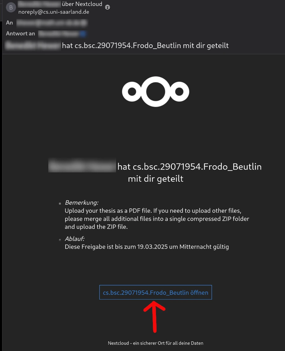 Sie erhalten kurz nach der Anmeldung Ihrer Arbeit eine E-Mail von der Adresse noreply@cs.uni-saarland.de mit einem Link (unten zur Verdeutlichung mit rotem Pfeil markiert) zum hochladen Ihrer Thesis.